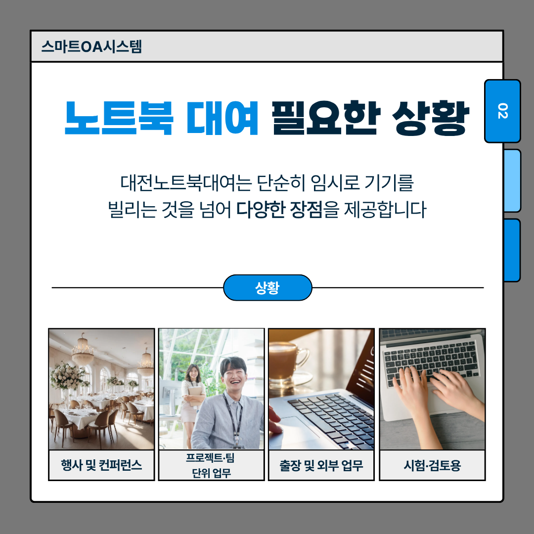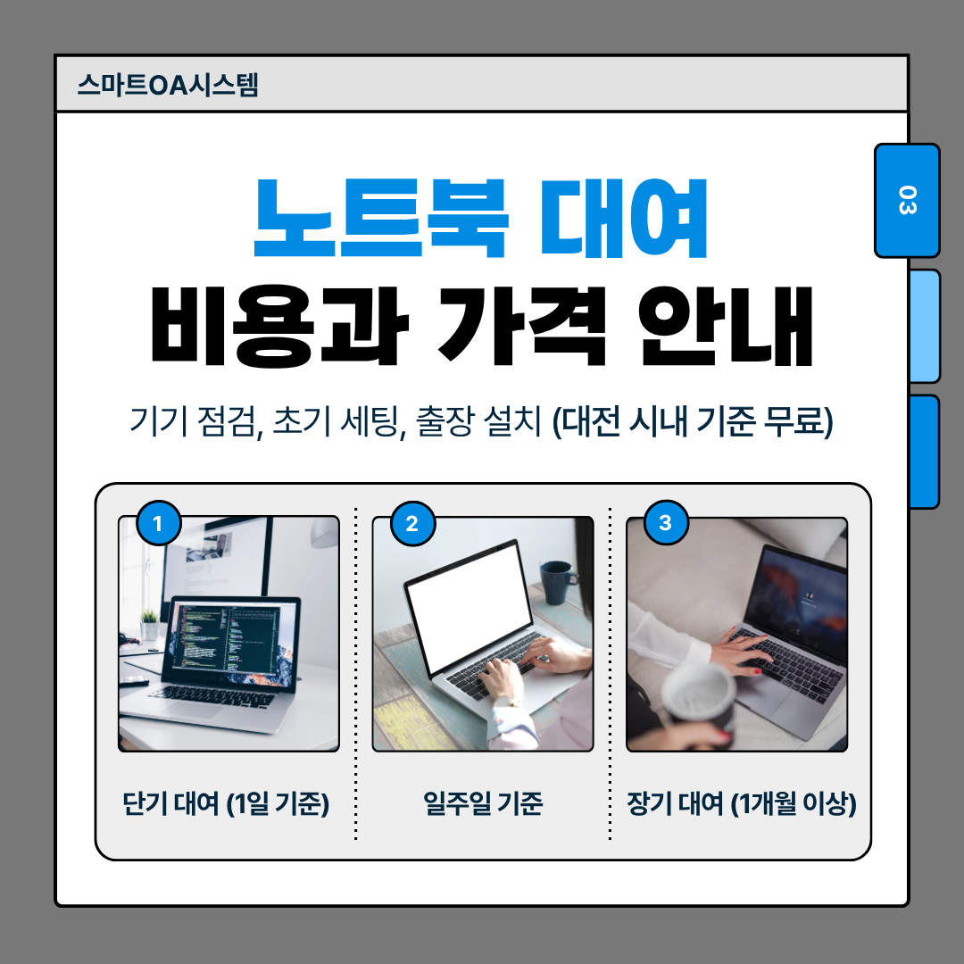 ¾È³çÇϼ¼¿ä, ´ëÀü½º¸¶Æ®¿À¿¡À̽ýºÅÛÀÔ´Ï´Ù.ÃÖ±Ù ±â¾÷°ú ±â°ü»Ó¸¸ ¾Æ´Ï¶ó °³ÀÎ °í°´ºÐµé²²¼µµ ´Ü±â ȤÀº ÇÁ·ÎÁ§Æ®¼ºÀ¸·Î ³ëÆ®ºÏÀÌ ÇÊ¿äÇÑ »óȲÀÌ ¸¹¾ÆÁö°í ÀÖ½À´Ï´Ù. ÇÏÁö¸¸ ±¸¸ÅÇϱ⿣ ºÎ´ã½º·´°í Àá½Ã ¾²±â¿¡´Â °ü¸®°¡ ¹ø°Å·Ó´Ù´Â ´ÜÁ¡ÀÌ ÀÖ½À´Ï´Ù.ÀÌ·± °æ¿ì ÇÕ¸®ÀûÀÎ ¼±ÅÃÀÌ ¹Ù·Î ³ëÆ®ºÏ ´ë¿© ¼ºñ½ºÀÔ´Ï´Ù. ÀúÈñ´Â ÃֽŠÀåºñ¿Í ¾ÈÁ¤ÀûÀÎ °ü¸® ü°è¸¦ ÅëÇØ °í°´´ÔÀÌ ÇÊ¿ä·Î ÇÏ´Â ½ÃÁ¡¿¡ ¸ÂÃç ÃÖÀûÀÇ È¯°æÀ» Á¦°øÇÕ´Ï´Ù.³ëÆ®ºÏ ´ë¿©ÀÇ ÀåÁ¡ÃÖ½ÅÇü Àåºñ »ç¿ë °¡´ÉÇà»ç¡¤¾÷¹«¿¡ ¸Â°Ô ÃֽŠ»ç¾ç Àåºñ Á¦°øÀ¯¿¬ÇÑ »ç¿ë ±â°£1ÀÏ ´Ü±âºÎÅÍ Àå±â±îÁö »óȲ¿¡ ¸Â°Ô ¼±Åà °¡´ÉÃâÀå ¼³Ä¡ Æ÷ÇÔ´ëÀü ½Ã³» ¹«·á ÃâÀå ¼³Ä¡ Áö¿ø¾ÈÁ¤¼º º¸Àå±â±âÁ¡°Ë ¹× Ãʱ⠼¼ÆÃ ¿Ï·á ÈÄ Á¦°ø ³ëÆ®ºÏ ´ë¿©°¡ ÇÊ¿äÇÑ »óȲÇà»ç ¹× ÄÁÆÛ·±½º¹ßÇ¥¿ë, Âü°¡ÀÚ¿ë ³ëÆ®ºÏ ÇÊ¿äÇÒ ¶§ÇÁ·ÎÁ§Æ® ¹× ´ÜÀ§ ¾÷¹«´Ü±â°£ °í»ç¾ç Àåºñ°¡ ÇÊ¿äÇÑ ¾÷¹«ÃâÀå ¹× ¿ÜºÎ ¾÷¹«»ç¹«½Ç ¹Û¿¡¼µµ ¾ÈÁ¤ÀûÀÎ ÀÛ¾÷ ȯ°æ ÇÊ¿ä ½Ã½ÃÇè ¹× °ËÅä¿ë Àӽà Æò°¡³ª ³»ºÎ °ËÅ並 À§ÇÑ Àåºñ È®º¸ ³ëÆ®ºÏ ´ë¿© ºñ¿ë ¾È³»´Ü±â ´ë¿©(1ÀÏ ±âÁØ)ÇÕ¸®Àû °¡°ÝÀ¸·Î ÇÏ·ç »ç¿ë °¡´ÉÀÏÁÖÀÏ ±âÁشܱâ ÇÁ·ÎÁ§Æ® ¹× ÃâÀå¿¡ ÀûÇÕÀå±â ´ë¿©(1°³¿ù ÀÌ»ó)Àå±â ÀÌ¿ë ½Ã ÇÒÀÎ Àû¿ë, ´õ Àú·ÅÇÑ ºñ¿ëÆ÷ÇÔ ¼ºñ½º ±â±â Á¡°Ë, Ãʱ⠼¼ÆÃ, ´ëÀü ½Ã³» ÃâÀå ¼³Ä¡ ¹«·á