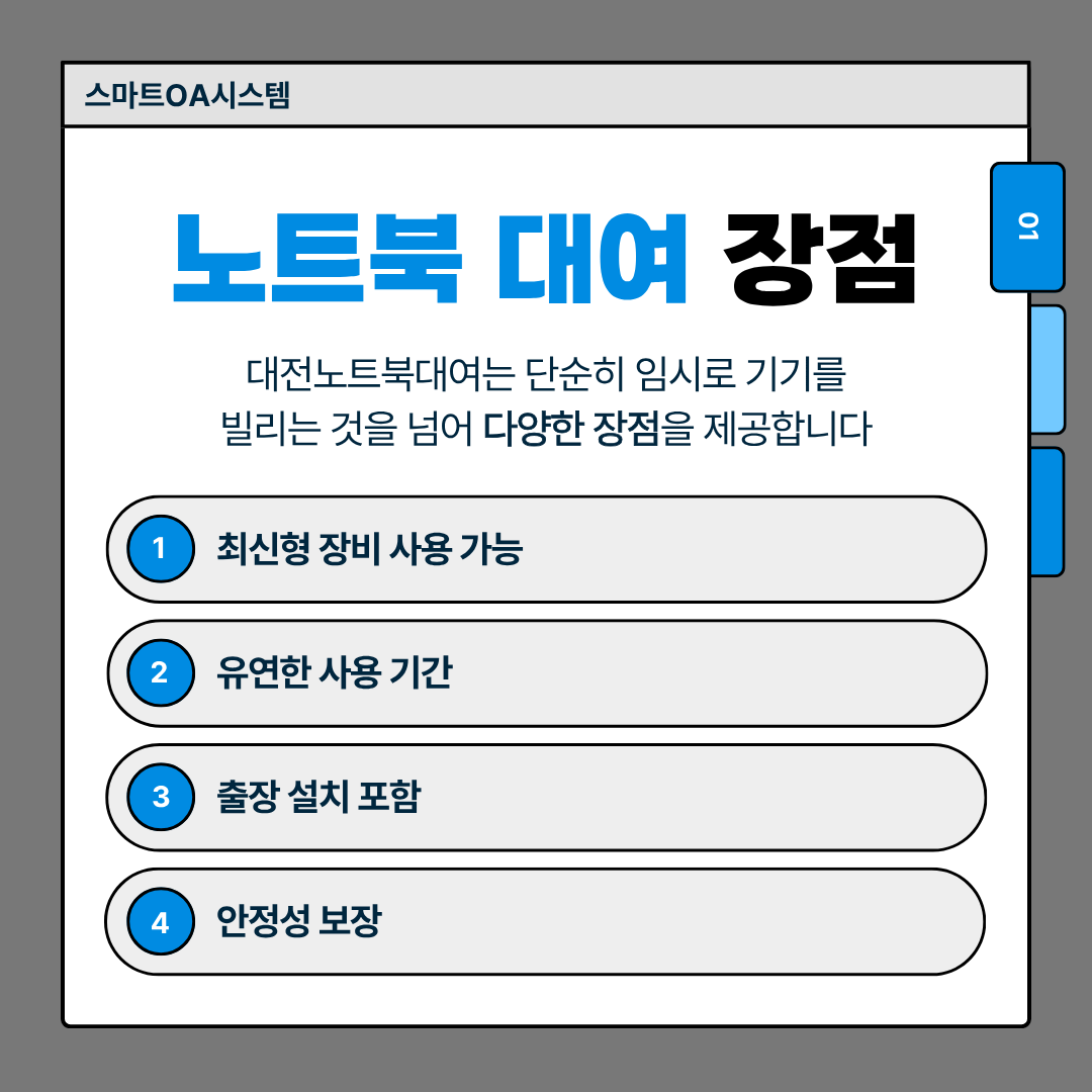 ÀÚÁÖ ¹¯´Â Áú¹® (Q&A) Q. ³ëÆ®ºÏ ·»Å» Áö¿ªÀº ¾îµð±îÁö °¡´ÉÇѰ¡¿ä?A. ´ëÀüÀ» ºñ·ÔÇØ ¼¼Á¾, ûÁÖ µî Àα٠Áö¿ª±îÁö °¡´ÉÇÕ´Ï´Ù.Q. Àå±â ´ë¿©ÇÒ¼ö·Ï ºñ¿ëÀÌ Àú·ÅÇѰ¡¿ä?A. ³×, 1°³¿ù ÀÌ»ó Àå±â ´ë¿© ½Ã ´Ü°¡°¡ ³·¾ÆÁ® ´õ °æÁ¦ÀûÀÔ´Ï´Ù.Q. ´ë¿© ½Ã ¾î¶² ¼ºñ½º°¡ Æ÷ÇԵdzª¿ä?A. ±â±â Á¡°Ë, Ãʱ⠼¼ÆÃ, ÃâÀå ¼³Ä¡(´ëÀü ½Ã³» ±âÁØ ¹«·á)°¡ Æ÷ÇԵ˴ϴÙ.´ëÀü½º¸¶Æ®¿À¿¡À̽ýºÅÛÀº ÇÊ¿äÇÑ ±â°£¸¸ ÇÕ¸®ÀûÀÎ ºñ¿ëÀ¸·Î³ëÆ®ºÏÀ» »ç¿ëÇÒ ¼ö ÀÖµµ·Ï Áö¿øÇÕ´Ï´Ù.ÃֽŠÀåºñ Á¦°øÀº ¹°·Ð, ¼³Ä¡ºÎÅÍ °ü¸®±îÁö Ã¥ÀÓÁö´Â ¼ºñ½º·Î °í°´´ÔÀÇ ¾÷¹«¿Í Çà»ç¸¦ ´õ¿í ¿øÈ°ÇÏ°Ô ¸¸µé¾îµå¸³´Ï´Ù.¾ÕÀ¸·Îµµ ¹ÏÀ» ¼ö ÀÖ´Â ÆÄÆ®³Ê·Î¼ ÃÖÀûÀÇ ¼Ö·ç¼ÇÀ» Á¦°øÇϰڽÀ´Ï´Ù.