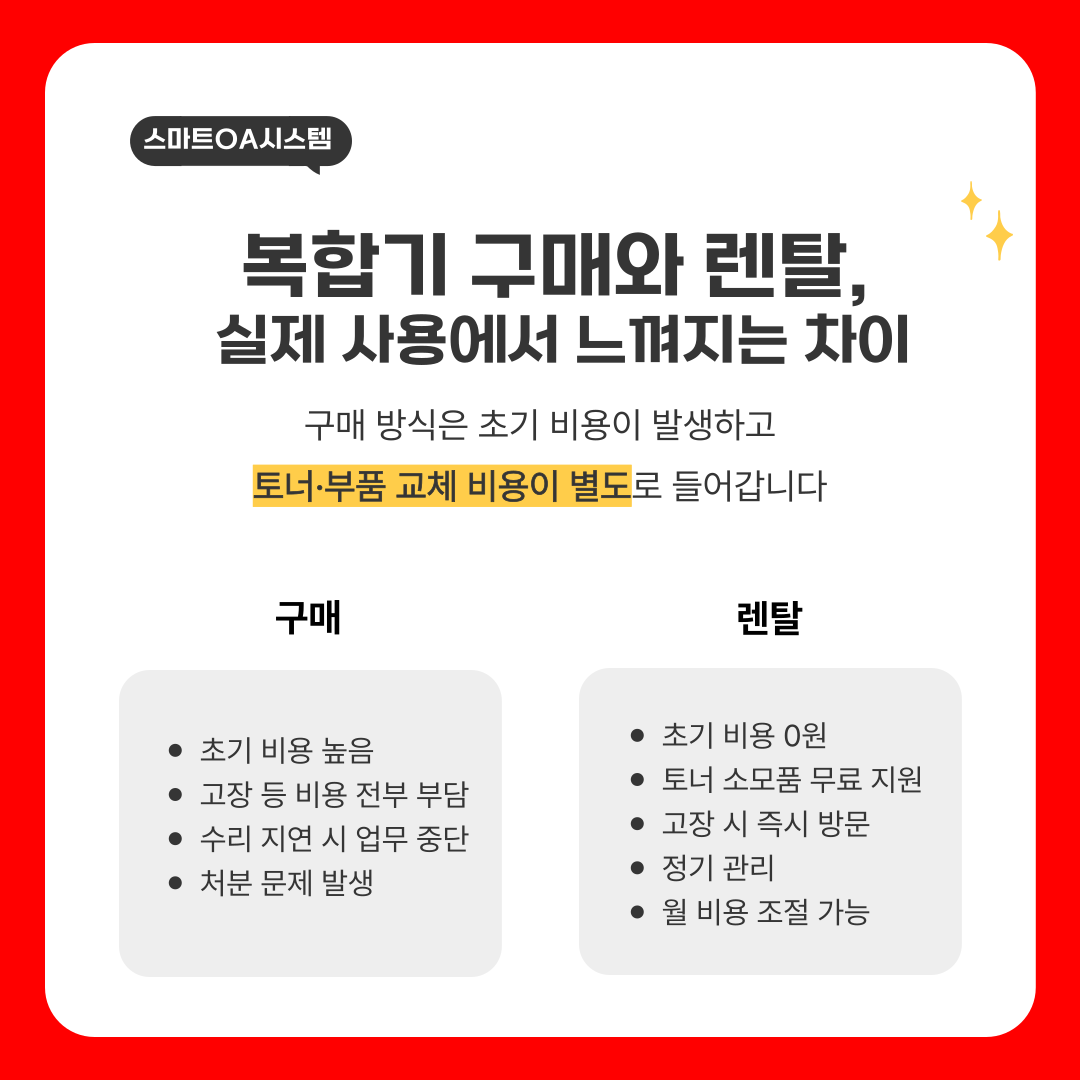 ·»Å» °è¾à Àü ²À È®ÀÎÇØ¾ß ÇÒ 5°¡Áöº¹Çձ⠷»Å»Àº Àå±â °è¾àÀÎ ¸¸Å, °è¾à Àü Á¶°Ç È®ÀÎÀÌ ¸Å¿ì Áß¿äÇÕ´Ï´Ù.ù°, ¿ù Ãâ·Â·® ±âÁØÀÌ ¸íÈ®ÇÑÁö È®ÀÎÇØ¾ß ÇÕ´Ï´Ù.Èæ¹é¡¤Ä÷¯ Ãâ·Â ¸Å¼ö°¡ ¾î¶»°Ô ¼³Á¤µÇ¾î ÀÖ´ÂÁö°¡ ºñ¿ëÀÇ ±âÁØÀÌ µË´Ï´Ù.µÑ°, Åä³Ê ¹× µå·³ µî ¼Ò¸ðǰ Æ÷ÇÔ ¿©ºÎÀÔ´Ï´Ù.¼Ò¸ðǰÀÌ ¹«»óÀÎÁö À¯»óÀÎÁö¿¡ µû¶ó ½ÇÁ¦ ºñ¿ë Â÷À̰¡ Å®´Ï´Ù.¼Â°, Àå¾Ö ¹ß»ý ½Ã ¹æ¹® A/S ¹æ½ÄÀÔ´Ï´Ù.¿ø°Ý ´ëÀÀÀÎÁö, ÇöÀå ¹æ¹®ÀÎÁö¿¡ µû¶ó ¾÷¹« Áß´Ü ½Ã°£¿¡ Â÷À̰¡ »ý±é´Ï´Ù.³Ý°, ¾àÁ¤ ±â°£°ú Áßµµ ÇØÁö Á¶°ÇÀÔ´Ï´Ù.»ç¾÷ ȯ°æ º¯È ½Ã ºÎ´ãÀÌ µÇÁö ¾Ê´ÂÁö ¹Ì¸® È®ÀÎÇÏ´Â °ÍÀÌ ÁÁ½À´Ï´Ù.´Ù¼¸Â°, ¼³Ä¡¡¤Ã¶°Å ½Ã Ãß°¡ ºñ¿ë ¹ß»ý ¿©ºÎÀÔ´Ï´Ù.Ãʱ⠼³Ä¡³ª °è¾à Á¾·á ½Ã ºñ¿ëÀÌ ¹ß»ýÇÏ´ÂÁö ¿©ºÎµµ Ã¼Å©ÇØ¾ß ÇÕ´Ï´Ù.º¹ÇÕ±â´Â ´Ü¼øÈ÷ Ãâ·Â¸¸ Àß µÇ´Â Àåºñ°¡ ¾Æ´Õ´Ï´Ù.