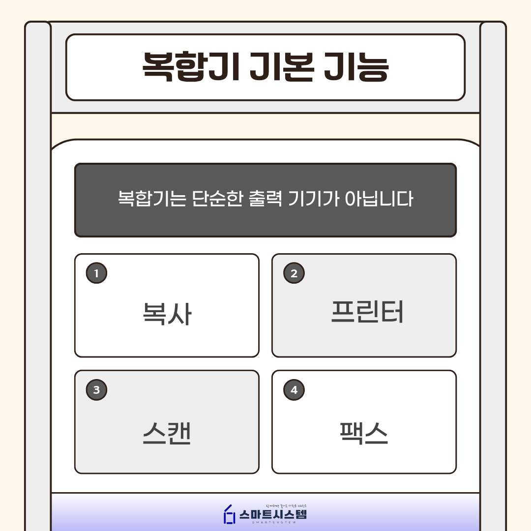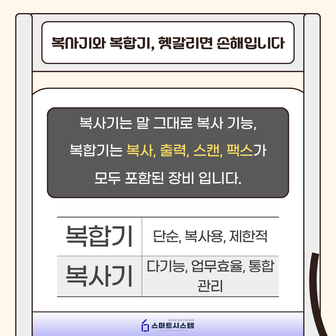 .º¹»ç±â¿Í º¹ÇÕ±âÀÇ Â÷ÀÌÁ¡ºÎÅÍ ÀÌÇØÇϱ⸹Àº ºÐµéÀÌ º¹»ç±â¿Í º¹Çձ⸦ °°Àº Àǹ̷Π»ç¿ëÇÏÁö¸¸±â´É°ú Ȱ¿ëµµ¿¡´Â ºÐ¸íÇÑ Â÷À̰¡ ÀÖ½À´Ï´Ù. º¹»ç±â´Â ¸» ±×´ë·Î ¹®¼¸¦ º¹»çÇÏ´Â ±â´É¿¡ ÃÊÁ¡ÀÌ ¸ÂÃçÁø ÀåºñÀÔ´Ï´Ù. ¹Ý¸é º¹ÇÕ±â´Â º¹»ç¡¤ÇÁ¸°ÅÍ¡¤½ºÄµ¡¤ÆÑ½º ±â´ÉÀ» ÇϳªÀÇ Àåºñ·Î ÅëÇÕÇÑ »ç¹«¿ë ±â±âÀÔ´Ï´Ù.ÃÖ±Ù »ç¹«È¯°æ¿¡¼´Â ´Ü¼ø º¹»çº¸´Ù PC Ãâ·Â, ½ºÄµ ÈÄ À̸ÞÀÏ Àü¼Û, ³×Æ®¿öÅ© °øÀ¯ Ãâ·Â µî º¹ÇÕÀûÀÎ ÀÛ¾÷ÀÌ ÀÏ»óȵǾî ÀÖ½À´Ï´Ù. ÀÌ ¶§¹®¿¡ ´ÜÀÏ ±â´É Àåºñº¸´Ù º¹Çձ⸦ ¼±ÅÃÇÏ´Â ºñÁßÀÌ ³ô¾ÆÁ³°í´ëÀüº¹ÇÕ±âÀÓ´ë ¿ª½Ã ´ëºÎºÐ º¹ÇÕ±â Áß½ÉÀ¸·Î ÀÌ·ç¾îÁö°í ÀÖ½À´Ï´Ù. º¹ÇձⰡ °®Ãç¾ß ÇÒ ±âº» ±â´Éº¹Çձ⸦ ¼±ÅÃÇÒ ¶§´Â ´Ü¼øÈ÷ ¡°Ãâ·ÂÀÌ µÈ´Ù¡±°¡ ¾Æ´Ï¶ó½ÇÁ¦ ¾÷¹« È帧¿¡ ÇÊ¿äÇÑ ±â´ÉÀÌ ¾ÈÁ¤ÀûÀ¸·Î ÀÛµ¿ÇÏ´ÂÁö°¡ Áß¿äÇÕ´Ï´Ù. ù°, º¹»ç ±â´ÉÀÔ´Ï´Ù. ´ë·® ¹®¼ ó¸® ½Ã ¼Óµµ¿Í Ãâ·Â ǰÁúÀÇ ¾ÈÁ¤¼ºÀÌ ±âº»ÀÔ´Ï´Ù. µÑ°, ÇÁ¸°ÅÍ ±â´ÉÀÔ´Ï´Ù. ³×Æ®¿öÅ© ¿¬°á°ú ´Ù¼ö PC µ¿½Ã Ãâ·Â ȯ°æ¿¡¼µµ ¿À·ù ¾øÀÌ ÀÛµ¿ÇØ¾ß ÇÕ´Ï´Ù. ¼Â°, ½ºÄµ ±â´ÉÀÔ´Ï´Ù. ¹®¼¸¦ Àü»êÈÇØ À̸ÞÀÏÀ̳ª ¼¹ö·Î Àü¼ÛÇÏ´Â ±â´ÉÀº ¾÷¹« È¿À²¿¡ Á÷Á¢ÀûÀÎ ¿µÇâÀ» ÁÝ´Ï´Ù. ³Ý°, ÆÑ½º ±â´ÉÀÔ´Ï´Ù. ¾ÆÁ÷ ÆÑ½º¸¦ »ç¿ëÇÏ´Â ¾÷Á¾À̳ª °ü°ø¼¿ÍÀÇ ¾÷¹«°¡ ÀÖ´Ù¸é Áß¿äÇÑ ¿ä¼ÒÀÔ´Ï´Ù.