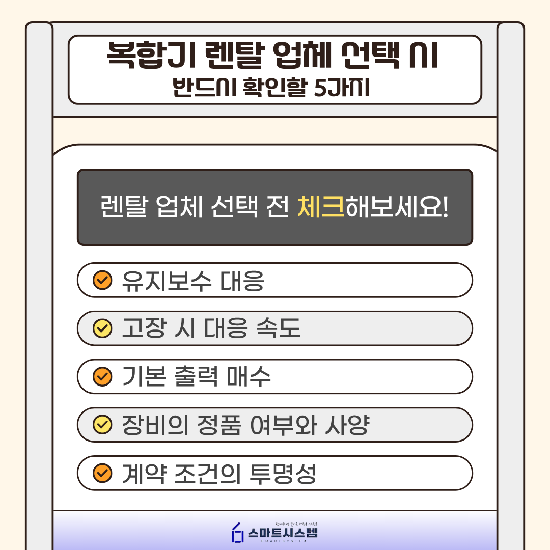 1. À¯Áöº¸¼ö ´ëÀÀ ü°èº¹ÇÕ±â´Â »ç¿ë Áß ¼Ò¸ðǰ ±³Ã¼³ª ¼³Á¤ ¿À·ù, ±â°èÀû ¹®Á¦°¡ ¹ß»ýÇÒ ¼ö ÀÖ½À´Ï´Ù. À¯Áöº¸¼ö°¡ °è¾à¿¡ Æ÷ÇԵǾî ÀÖ´ÂÁö, Ãß°¡ ºñ¿ëÀº ¾ø´ÂÁö ¹Ýµå½Ã È®ÀÎÇØ¾ß ÇÕ´Ï´Ù.2. °íÀå ½Ã ´ëÀÀ ¼ÓµµÃâ·ÂÀÌ ¸ØÃß¸é ¾÷¹«µµ ¸ØÃä´Ï´Ù. ¹æ¹® ¼ö¸® ¶Ç´Â ¿ø°Ý Áö¿øÀÌ ¾ó¸¶³ª ºü¸£°Ô ÀÌ·ç¾îÁö´ÂÁö°¡ ¸Å¿ì Áß¿äÇÕ´Ï´Ù. ½ÇÁ¦·Î ´ëÀüº¹ÇÕ±âÀÓ´ë ¸¸Á·µµ´Â ´ëÀÀ ¼Óµµ¿¡¼ Å©°Ô °¥¸³´Ï´Ù.3. ±âº» Ãâ·Â ¸Å¼ö Á¶°Ç¿ù ·»Å»·á¿¡ Æ÷ÇÔµÈ Èæ¹é¡¤Ä÷¯ Ãâ·Â ¸Å¼ö°¡ ¾ó¸¶ÀÎÁö, Ãʰú ½Ã ºñ¿ë ±¸Á¶´Â ¾î¶»°Ô µÇ´ÂÁö ¸íÈ®ÇØ¾ß ÇÕ´Ï´Ù. ÀÌ ºÎºÐÀÌ ºÒÅõ¸íÇÏ¸é ¿¹»óº¸´Ù ºñ¿ëÀÌ ´Ã¾î³¯ ¼ö ÀÖ½À´Ï´Ù.4. ÀåºñÀÇ Á¤Ç° ¿©ºÎ¿Í »ç¾çÁ¤Ç° ÀåºñÀÎÁö, »ç¾çÀº ¾î´À ¼öÁØÀÎÁö È®ÀÎÇØ¾ß ÇÕ´Ï´Ù. Ãâ·Â ǰÁú°ú ±â±â ¼ö¸íÀº Àåºñ »óÅ¿¡ µû¶ó Å« Â÷À̰¡ ³³´Ï´Ù.5. °è¾à Á¶°ÇÀÇ Åõ¸í¼º°è¾à ±â°£, Áßµµ ÇØÁö Á¶°Ç, »ç¿ë·® º¯°æ °¡´É ¿©ºÎ µî °è¾à ³»¿ëÀÌ ¸íÈ®ÇØ¾ß ÇÕ´Ï´Ù. ÃßÈÄ ºÐÀïÀ» ÁÙÀ̱â À§Çؼ¶óµµ ²Ä²ÄÈ÷ »ìÆìº¸´Â °ÍÀÌ ÁÁ½À´Ï´Ù.