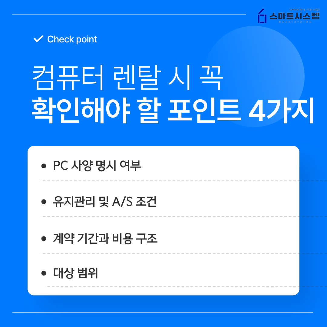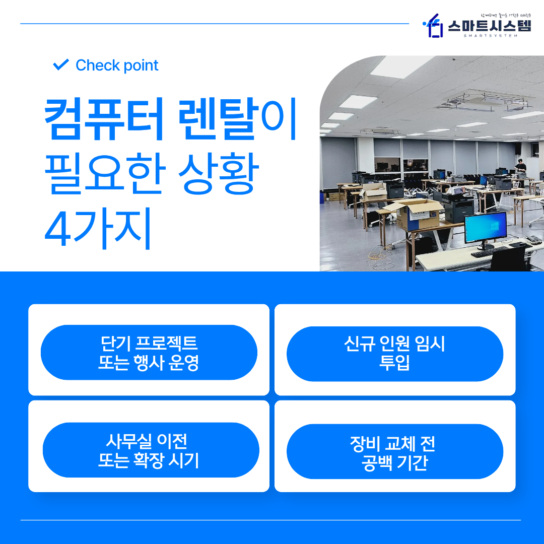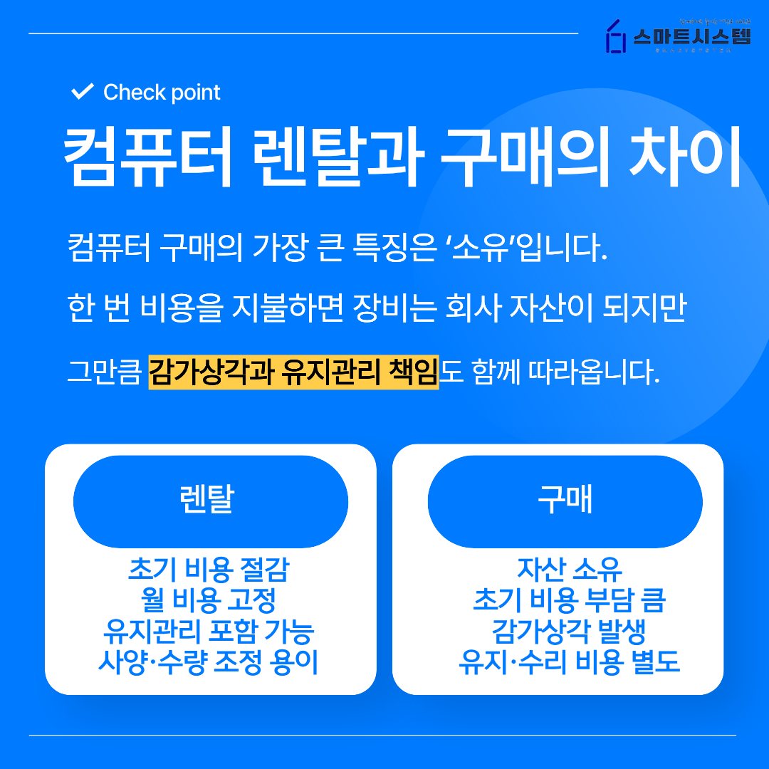 ¹Ý¸é ·»Å»Àº Ãʱ⠺ñ¿ë ºÎ´ã ¾øÀÌ ÇÊ¿äÇÑ ±â°£ µ¿¾È »ç¿ë °¡´ÉÇϸçÀåºñ °ü¸®¿Í A/S°¡ Æ÷ÇԵǴ °æ¿ì°¡ ¸¹¾Æ ¿î¿µ ºÎ´ãÀ» ÁÙÀÏ ¼ö ÀÖ½À´Ï´Ù. ƯÈ÷ ¾÷¹« ±Ô¸ð³ª Àοø º¯µ¿ÀÌ ÀæÀº ȯ°æ¿¡¼´Â À¯¿¬¼ºÀÌ Å« ÀåÁ¡ÀÌ µË´Ï´Ù. 2. ÄÄÇ»ÅÍ ·»Å»ÀÌ ÇÊ¿äÇÑ »óȲ 4°¡Áö´Ü±â ÇÁ·ÎÁ§Æ® ¶Ç´Â Çà»ç ¿î¿µ¼öÁÖ »ç¾÷, ¹Ú¶÷ȸ, ±³À°, Çà»çó·³ ÀÏÁ¤ ±â°£¸¸ ÇÊ¿äÇÑ °æ¿ì ±¸¸Åº¸´Ù ·»Å»ÀÌ È¿À²ÀûÀÔ´Ï´Ù.½Å±Ô Àοø Àӽà ÅõÀÔ°è¾àÁ÷, ÆÄ°ß ÀηÂ, ½ÃÁ𼺠Àοø Áõ°¡ ½Ã Àåºñ¸¦ Áï½Ã È®º¸ÇÒ ¼ö ÀÖ½À´Ï´Ù.»ç¹«½Ç ÀÌÀü ¶Ç´Â È®Àå ½Ã±âÀÌÀü¡¤È®Àå °úÁ¤¿¡¼ Àӽà »ç¿ë Àåºñ·Î ·»Å»À» Ȱ¿ëÇÏ¸é ºÒÇÊ¿äÇÑ ±¸¸Å¸¦ ÁÙÀÏ ¼ö ÀÖ½À´Ï´Ù.Àåºñ ±³Ã¼ Àü °ø¹é ±â°£±âÁ¸ PC ±³Ã¼ Àü±îÁö ¾÷¹« °ø¹é ¾øÀÌ À̾±â À§ÇÑ Àӽà ´ë¾ÈÀ¸·Î ÀûÇÕÇÕ´Ï´Ù. 3. ÄÄÇ»ÅÍ ·»Å» ½Ã ²À È®ÀÎÇØ¾ß ÇÒ Æ÷ÀÎÆ® 4°¡ÁöPC »ç¾ç ¸í½Ã ¿©ºÎCPU ¼¼´ë, ¸Þ¸ð¸®, ÀúÀåÀåÄ¡(SSD/HDD) µî ±¸Ã¼ÀûÀÎ »ç¾çÀÌ ¸íÈ®È÷ ¾È³»µÇ´ÂÁö È®ÀÎÇØ¾ß ÇÕ´Ï´Ù.À¯Áö°ü¸® ¹× A/S Á¶°Ç°íÀå ½Ã ´ëÀÀ ¹æ½Ä, ¹æ¹® A/S °¡´É ¿©ºÎ, ó¸® ¼Óµµ´Â ¾÷¹« ¿¬¼Ó¼º°ú Á÷°áµË´Ï´Ù.°è¾à ±â°£°ú ºñ¿ë ±¸Á¶¿ù ·»Å»·á ¿Ü Ãß°¡ ºñ¿ë ¹ß»ý ¿©ºÎ, ´Ü±â¡¤Àå±â °è¾à Á¶°ÇÀ» ²Ä²ÄÈ÷ »ìÆì¾ß ÇÕ´Ï´Ù.´ë»ó ¹üÀ§º»Ã¼¸¸ ·»Å»ÀÎÁö, ¸ð´ÏÅÍ¡¤ÁÖº¯±â±â Æ÷ÇÔ ¿©ºÎ±îÁö È®ÀÎÇÏ´Â °ÍÀÌ ÁÁ½À´Ï´Ù. ÄÄÇ»ÅÍ ·»Å»Àº ´Ü¼øÈ÷ ¡°½Î°Ô ¾²´Â ¹æ¹ý¡±ÀÌ ¾Æ´Ï¶ó¾÷¹« »óȲ¿¡ ¸Â°Ô À¯¿¬ÇÏ°Ô ¿î¿µÇÏ´Â ¼±ÅÃÁöÀÔ´Ï´Ù. ½º¸¶Æ®¿À¿¡À̽ýºÅÛÀº ´ëÀü¡¤¼¼Á¾ Áö¿ªÀ» Áß½ÉÀ¸·Î ½ÇÁ¦ ¾÷¹« ȯ°æÀ» °í·ÁÇÑ Àåºñ ±¸¼º°ú ½Å¼ÓÇÑ Áö¿øÀ» ÅëÇØ ±â¾÷°ú ±â°üÀÇ ºÎ´ãÀ» ÁÙÀÌ´Â ¹æÇâÀ» ÁöÇâÇϰí ÀÖ½À´Ï´Ù. ±¸¸Å¿Í ·»Å» Áß ¾î¶² ¼±ÅÃÀÌ ¸Â´ÂÁö´Â »óȲ¸¶´Ù ´Ù¸¨´Ï´Ù.